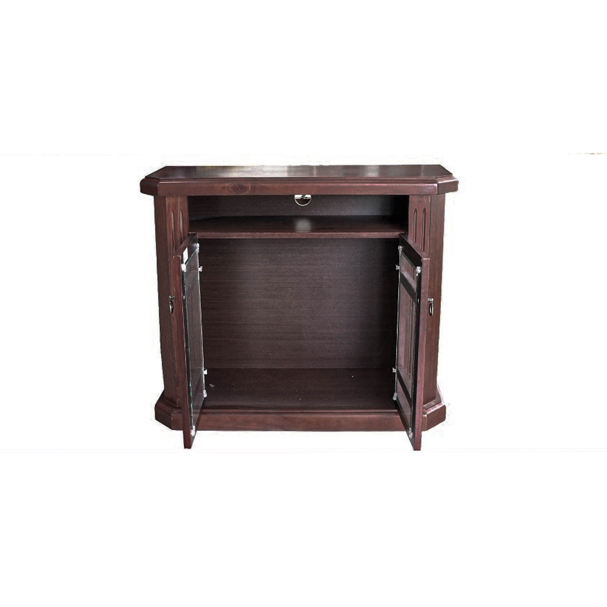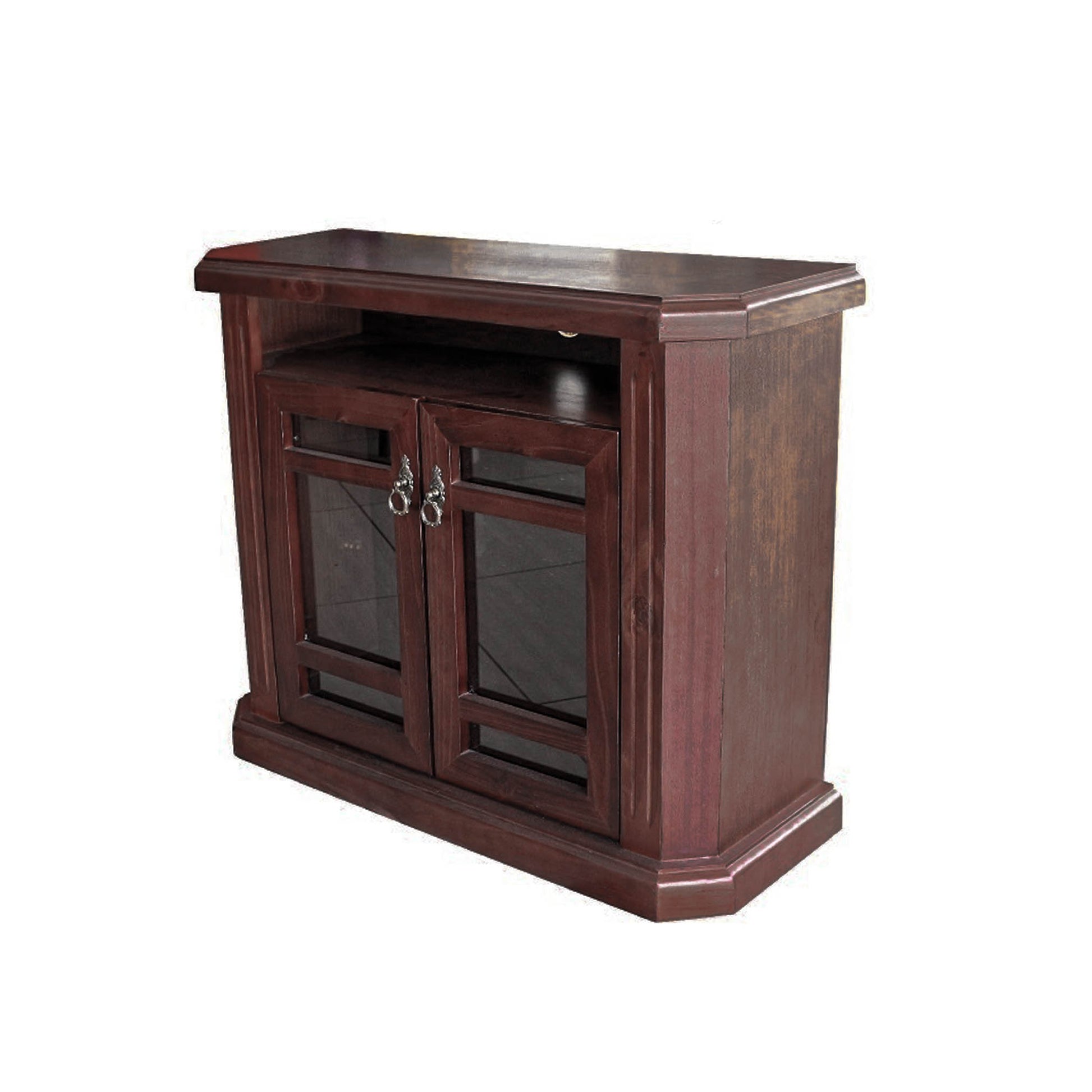 Material: Fabricada con pino radiata con altos estandares de calidad, barnizada con hydrospay color nogal paris. Con dos vitrinas en el centro